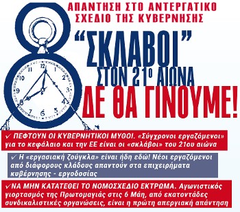 Την ίδια στιγμή, όμως, συνδικαλιστικές οργανώσεις σε όλη τη χώρα προετοιμάζουν στις 6 Μάη την ηχηρή απάντησή τους σ' αυτές τις άθλιες «ανατροπές του αιώνα». Εργατικά Κέντρα, Ομοσπονδίες και Σωματεία προστίθενται καθημερινά στο απεργιακό μέτωπο, που αρνείται να ξαναγίνουμε οι σκλάβοι του 21ου αιώνα, στην Ελλάδα της δυστοπίας. Εγινε σαφές στην πρόσφατη ομιλία του πρωθυπουργού ότι όλα αυτά σχεδιάζονται με βάση τα συμφέροντα των βιομηχάνων και της εργοδοσίας, και βεβαίως τις ντιρεκτίβες της Ευρωπαϊκής Ενωσης. Η ψήφιση του νομοσχεδίου, άλλωστε, είναι προαπαιτούμενο για την εκταμίευση της πρώτης δόσης του πακέτου ανάκαμψης, από τα 75 δισ. που θα πάρει η χώρα. Ετσι, από τη μία η κυβέρνηση αναφέρεται στη «δημιουργία πολλών και καλών θέσεων εργασίας» και από την άλλη αποκρύπτει, μαζί με τα υπόλοιπα κόμματα, ότι το Ταμείο Ανάκαμψης της ΕΕ δεν είναι παρά ακόμα μια θηλιά κρεμάλας για τους λαούς της Ευρώπης και για εμάς, που θα την πληρώσουμε με σκληρά, αντιλαϊκά μέτρα, όπως η επιβολή της 10ωρης δουλειάς.
