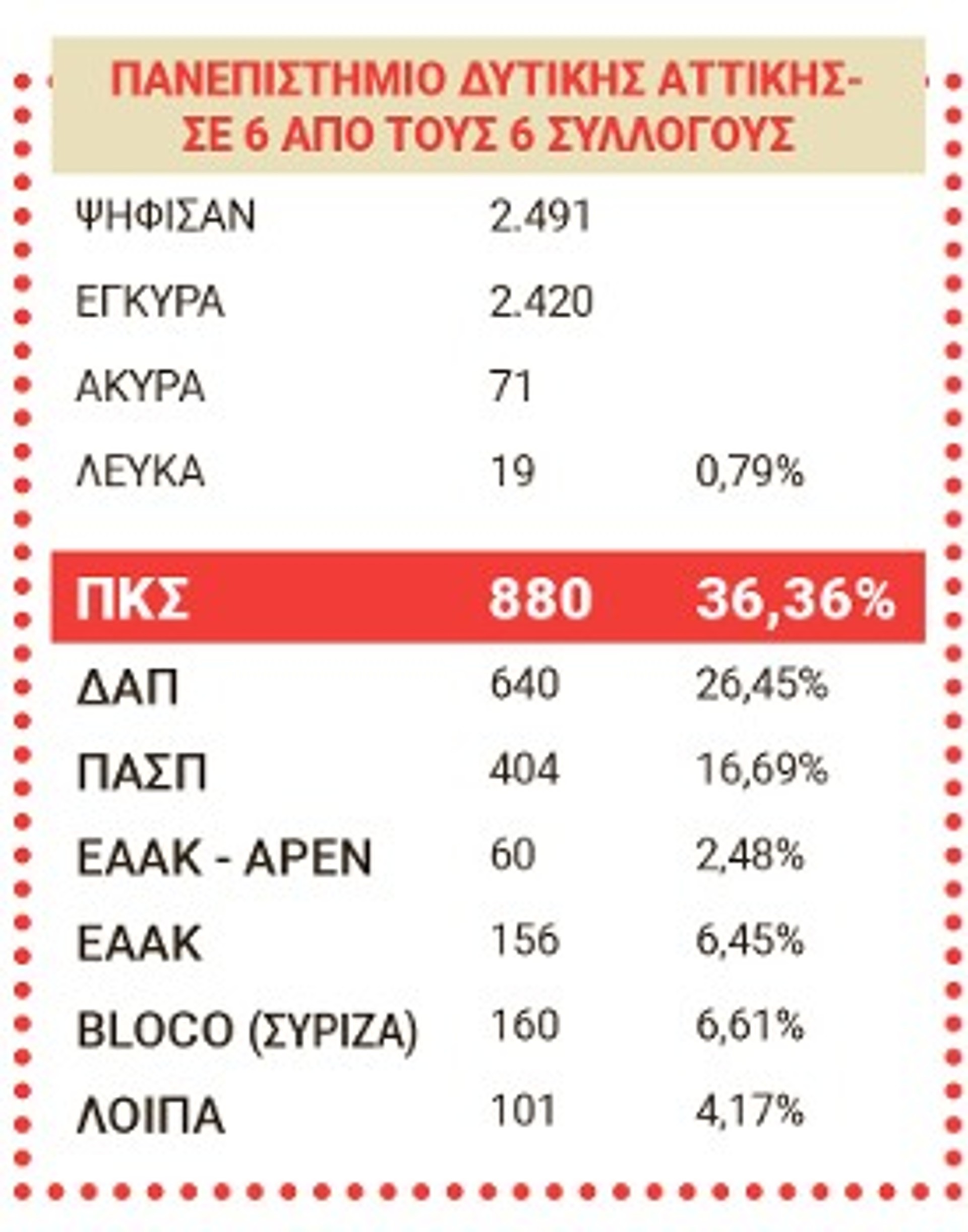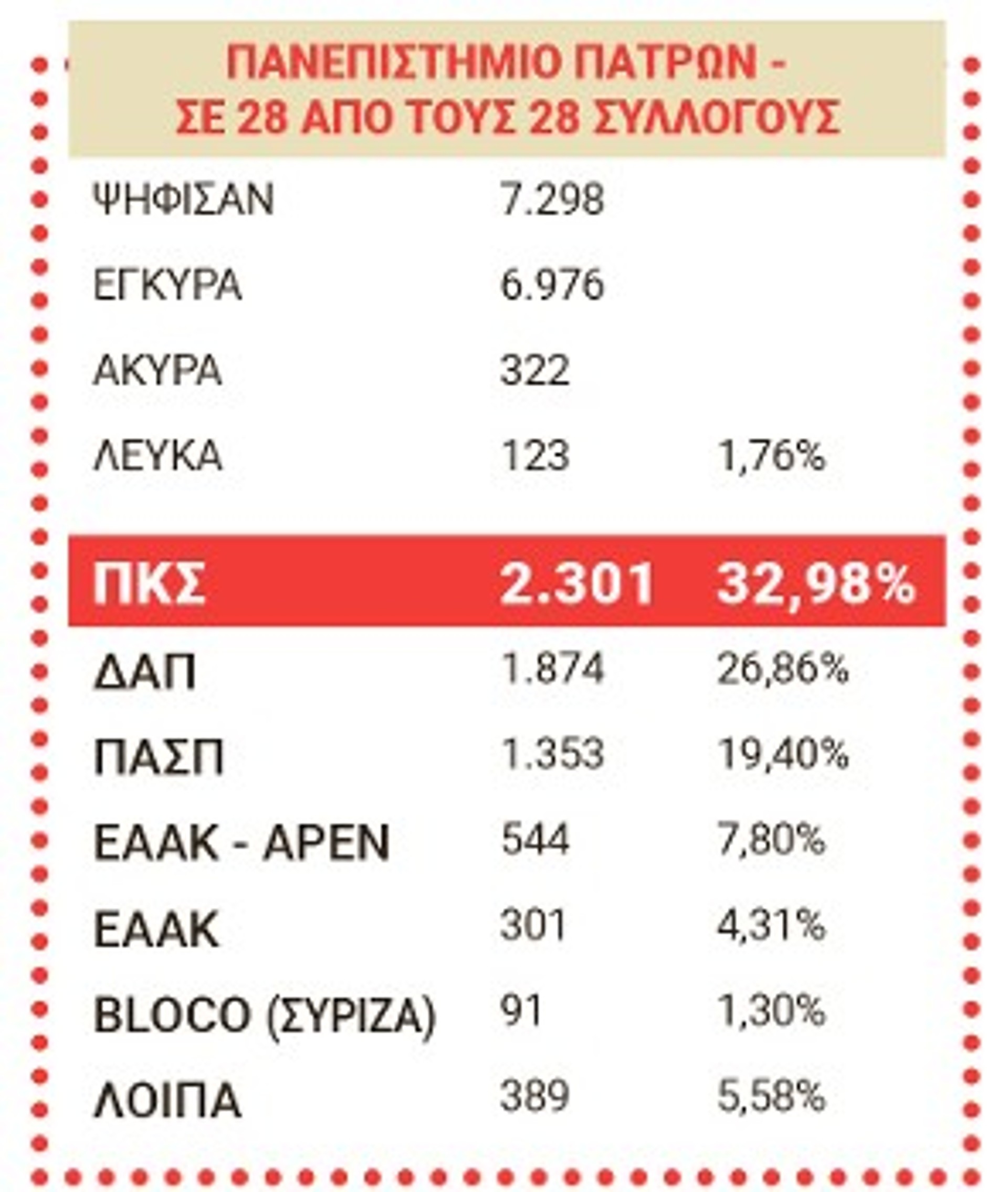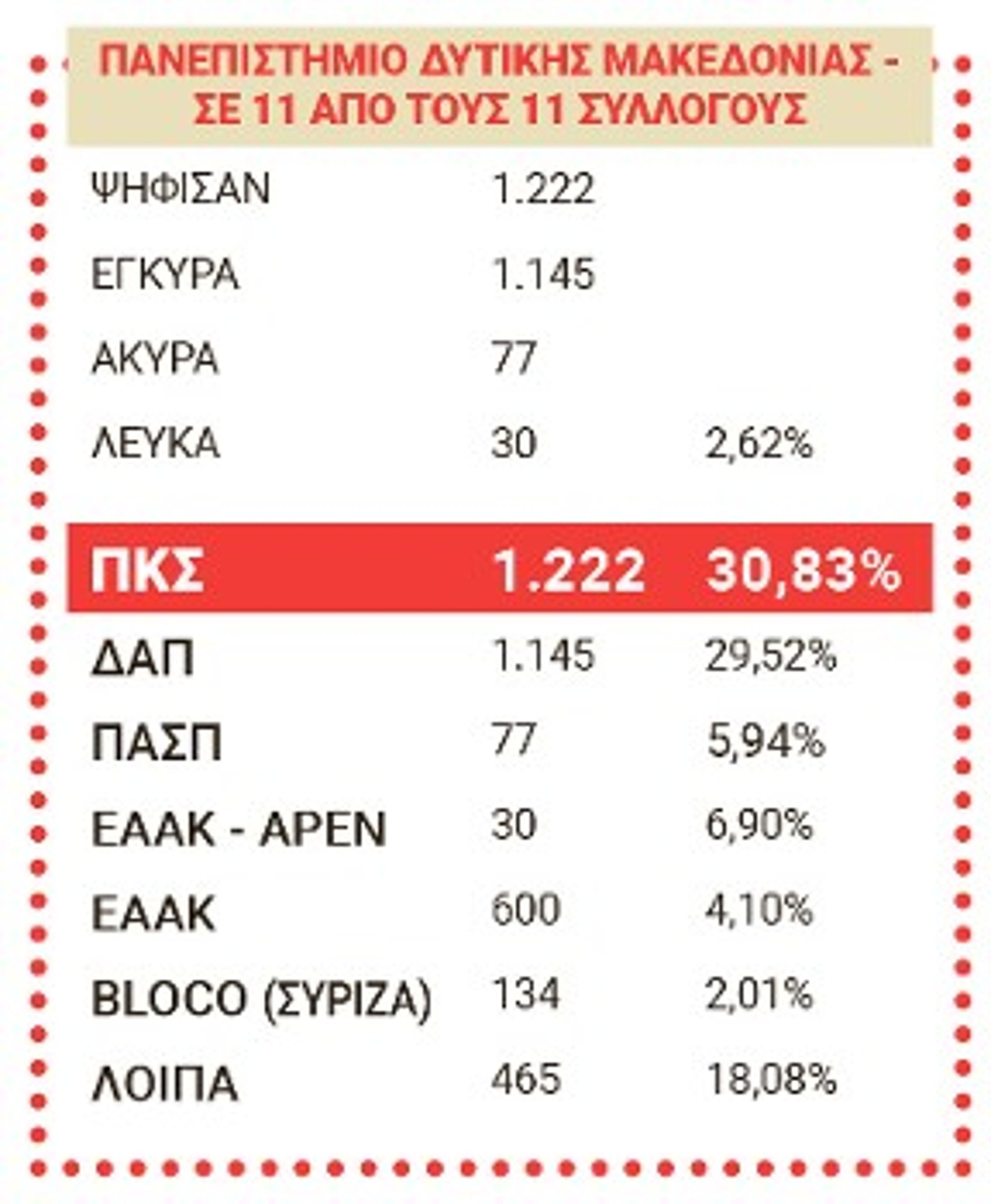 Απ' αυτούς τους 274 φέτος 6 σύλλογοι δεν έκαναν εκλογές (Στατιστικής Πανεπιστημίου Αιγαίου, Μηχανικών Σχεδίασης Προϊόντων και Συστημάτων Πανεπιστημίου Αιγαίου, Μουσικών Σπουδών Πανεπιστημίου Ιωαννίνων, Κινηματογράφου ΑΠΘ, Οργάνωσης και Διοίκησης Επιχειρήσεων Πανεπιστημίου Δυτικής Μακεδονίας, Δασολογίας, Επιστημών Ξύλου και Σχεδιασμού Πανεπιστημίου Θεσσαλίας), ενώ άλλος ένας σύλλογος, αυτός του Οικονομικού Πανεπιστημίου (πρώην ΑΣΟΕΕ), έχει προγραμματισμένες εκλογές για τις 25 Μάη, με βάση απόφαση Γενικής του Συνέλευσης. Πέρα από τους παραπάνω 7 συλλόγους, στο τελικό συγκεντρωτικό αποτέλεσμα δεν καταγράφονται επίσης 6 σύλλογοι που έκαναν εκλογές με ενιαίο ψηφοδέλτιο (Περιβάλλοντος Ιονίου Πανεπιστημίου, ΤΕΦΑΑ ΑΠΘ στις Σέρρες, Επιστήμης Διατροφής και Διαιτολογίας ΕΛΜΕΠΑ, Θεατρικών Σπουδών Πανεπιστημίου Πελοποννήσου, Οργάνωσης και Διαχείρισης Αθλητισμού Πανεπιστημίου Πελοποννήσου, Φυσικής Πανεπιστημίου Θεσσαλίας), καθώς και οι σύλλογοι Θεολογίας και Κοινωνικής Θεολογίας του ΕΚΠΑ, όπου λόγω νοθείας δεν μπορεί να αναγνωριστεί το αποτέλεσμα και οι εκλογές σε αυτούς τους συλλόγους είναι άκυρες.