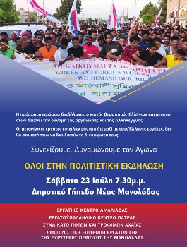 Αντίστοιχο μήνυμα συμπαράστασης έστειλαν επίσης η Ομοσπονδία Οικοδόμων και το Συνδικάτο Οικοδόμων Αθήνας.