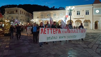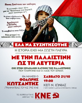 Εδώ σήμερα, από το Σύνταγμα, ενώνουμε τις φωνές μας με τις φωνές όλων των λαών και βροντοφωνάζουμε ΛΕΥΤΕΡΙΑ ΣΤΗΝ ΠΑΛΑΙΣΤΙΝΗ. Να σταματήσει τώρα η σφαγή αμάχων από το ισραηλινό κράτος - δολοφόνο. Καμία εμπλοκή της Ελλάδας, καμία στήριξη στο έγκλημα. Να επιστρέψει τώρα πίσω το ελληνικό πολεμικό πλοίο από την εμπόλεμη περιοχή. Ανεξάρτητο κράτος της Παλαιστίνης στα σύνορα του 1967, με πρωτεύουσα την Ανατολική Ιερουσαλήμ.