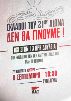Το 8ωρο αποτελεί έτσι κι αλλιώς «είδος υπό εξαφάνιση». Οι 13 ώρες δουλειάς καταργούν στην πράξη το 8ωρο - 5ήμερο - 40ωρο, σμπαραλιάζουν κάθε έννοια ελεύθερου χρόνου, αντικειμενικά προκαλούν ανεπανόρθωτη φθορά στον οργανισμό του εργαζόμενου.