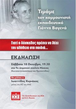 «Ιούνιος 1975: Ο Γιάννης Βαγενάς πραγματοποιεί 9 μέρες απεργία πείνας, υπερασπιζόμενος τα μορφωτικά δικαιώματα των μαθητών του, ενάντια στην επιδίωξη του αστικού κράτους να παρέμβει στον παιδαγωγικό του ρόλο.