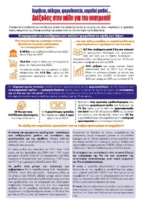 - Ερχεται ο νέος κρατικός προϋπολογισμός που προβλέπει φορολογικά έσοδα που ξεπερνούν τα 74 δισ. ευρώ, κυρίως από τη φοροαφαίμαξη του λαού, που ήδη πληρώνει το 95% του συνόλου των φόρων, ενώ εξασφαλίζει πάνω από 23 δισ. ευρώ επιδοτήσεων στο κεφάλαιο για την πολεμική προετοιμασία και την ανταγωνιστικότητα.