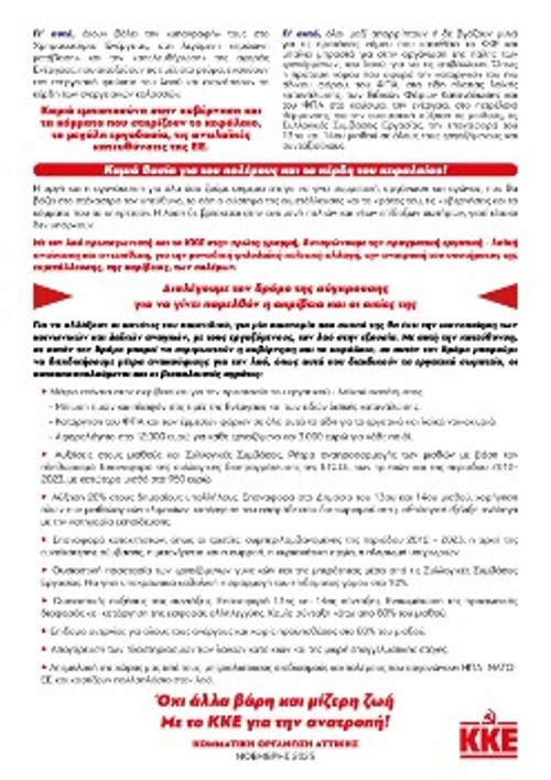 Η οργή και η αγανάκτηση για όλα όσα ζούμε σήμερα επείγει να γίνουν συμμετοχή, οργάνωση και αγώνας που θα βάζει στο στόχαστρο τον υπεύθυνο, το σάπιο σύστημα της εκμετάλλευσης και το κράτος του, τις κυβερνήσεις και τα κόμματα που το υπηρετούν. Η λύση δεν βρίσκεται στην αναμονή παλιών και νέων επίδοξων σωτήρων, γιατί τέτοιοι δεν υπάρχουν. Με τον λαό πρωταγωνιστή και το ΚΚΕ στην πρώτη γραμμή, δυναμώνουμε την πραγματική εργατική - λαϊκή αντίσταση και αντεπίθεση για τη μοναδική φιλολαϊκή πολιτική αλλαγή, την ανατροπή του συστήματος της εκμετάλλευσης, της ακρίβειας, των πολέμων.