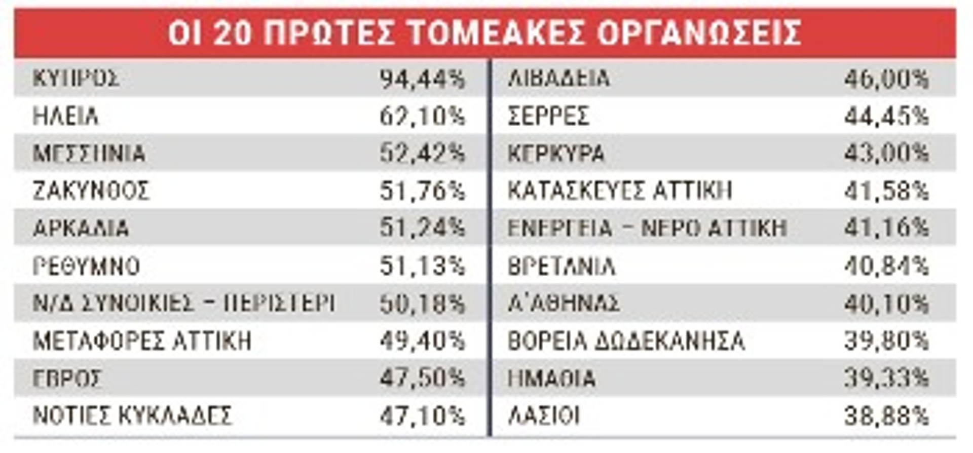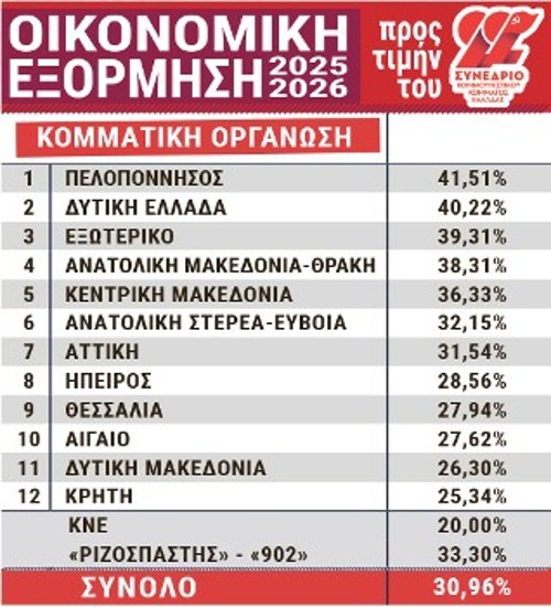 Στην κατάταξη των Οργανώσεων Περιοχής προηγείται η ΚΟ Πελοποννήσου, που με μια εντυπωσιακή αρχή βρίσκεται στο 41,51% του πλάνου της. Εξίσου γερό μπάσιμο στη μάχη έχει κάνει η ΚΟ Δυτικής Ελλάδας, που ακολουθεί με 40,22%. Την πρώτη τριάδα μετά το άνοιγμα της κούρσας συμπληρώνει η ΚΟ Εξωτερικού με 39,31%. Ακολουθούν η ΚΟ Ανατολικής Μακεδονίας - Θράκης με 38,31% και η ΚΟ Κεντρικής Μακεδονίας με 36,33%, ενώ πάνω από το σκαλοπάτι του 30% κινούνται και οι ΚΟ Ανατολικής Στερεάς - Εύβοιας με 32,15% και Αττικής με 31,54%. Στη συνέχεια βρίσκεται η ΚΟ Ηπείρου με 28,56% και έπονται πλάι - πλάι οι ΚΟ Θεσσαλίας με 27,94% και Αιγαίου με 27,62%. Στη «γαλαρία» προς το παρόν βρίσκονται οι ΚΟ Δυτικής Μακεδονίας με 26,30% και Κρήτης με 25,34%.