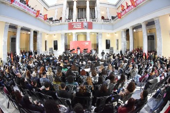 «Ενας αιώνας αγώνας και θυσία, το ΚΚΕ στην πρωτοπορία», «Ούτε σε ξερονήσια, ούτε σε φυλακές, ποτέ τους δεν λυγίσανε οι κομμουνιστές», τα συνθήματα έπεφταν βροχή καθώς γέμιζε το αίθριο του κτιρίου «Αβέρωφ» όπου γινόταν η εκδήλωση.