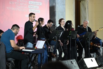 Η εκδήλωση συνεχίστηκε με αφιέρωμα στο αντιδικτατορικό τραγούδι από την Ορχήστρα της ΚΝΕ, υπό τη διεύθυνση του Τεό Λαζάρου. Το Πολυτεχνείο αντήχησε από τον «Οδηγητή» του Βάρναλη, από τα κόκκινα σημάδια στους τοίχους που σπαραχτικά περιγράφει ο Γ. Ρίτσος, μέχρι τον «Λεβέντη» που περιγράφει ο Νότης Περγιάλης και οι επικές μουσικές του Θεοδωράκη, του Λεοντή, του Λοΐζου πλημμύρισαν το Πολυτεχνείο, καθώς ανέμιζαν οι κόκκινες σημαίες και ενώνονταν οι καρδιές στο «Σφαγείο», στους χτύπους «τακ τακ εσύ, τακ τακ κι εγώ» που περιγράφει αξεπέραστα και η Αγγελική Σωτήρη στο βιβλίο της, που είχε την τιμητική του. Μέσα σε κλίμα συγκίνησης, μετά τον ύμνο στη Σπουδάζουσα και στον Λόχο «Λόρδος Μπάιρον», η εκδήλωση ολοκληρώθηκε με το κοινό όρθιο με υψωμένες γροθιές στο άκουσμα του «Υμνου της ΚΝΕ».