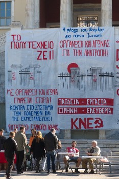 Στο ιστορικό κτίριο του Πολυτεχνείου στην Πατησίων, όλο το Σαββατοκύριακο και χτες το πρωί υπήρχε μια συνεχής παρουσία κόσμου κάθε ηλικίας που γέμιζε κάθε χώρο του, ενώ από τα μεγάφωνα διαβάζονταν οι ανακοινώσεις των συλλογικών φορέων, τα καλέσματα του ΚΚΕ και της ΚΝΕ για την ανάγκη να δυναμώσει η πάλη ενάντια στον ιμπεριαλιστικό πόλεμο και την εμπλοκή της χώρας, να μην δεχτούν ο λαός, η νεολαία, οι στρατευμένοι καμία θυσία για τα συμφέροντα των καπιταλιστών, με εφόδιο και την ιστορική πείρα των μεγάλων αγώνων.