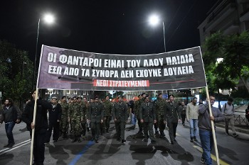 Μυριόστομα και δυνατά ακούστηκε το σύνθημα «Οι φαντάροι είναι του λαού παιδιά, έξω από τα σύνορα δεν έχουν δουλειά». Και το χειροκρότημα θερμό να συνοδεύει τους νέους στρατευμένους που για άλλη μια χρονιά έδωσαν το «παρών» στην πορεία του Πολυτεχνείου, παίρνοντας θέση στο πανό των Νέων Στρατευμένων, ενώ από πίσω ακολουθούσαν τα πανό της Πανελλήνιας Ομοσπονδίας Αποστράτων Στρατιωτικών και της Πανελλήνιας Ενωσης Αποστράτων Πυροσβεστικού Σώματος.