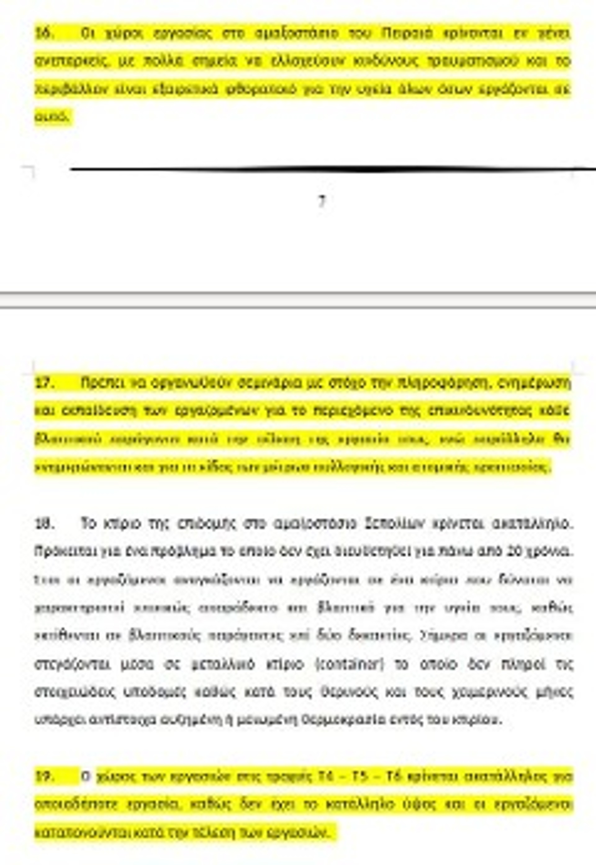 Και στο 19 γράφουν οι εργαζόμενοι: «Ο χώρος των εργασιών στις τροχιές Τ4 - Τ5 - Τ6 κρίνεται ακατάλληλος για οποιαδήποτε εργασία, καθώς δεν έχει το κατάλληλο ύψος και οι εργαζόμενοι καταπονούνται κατά την τέλεση των εργασιών».