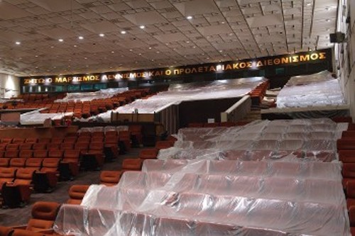 Ετσι έγινε κατορθωτό να υπάρχει η εικόνα που θα βλέπουν τα χιλιάδες μέλη και στελέχη του ΚΚΕ, οι καλεσμένοι, όλοι όσοι θα βρίσκονται στην έδρα της ΚΕ στον Περισσό τις μέρες του Συνεδρίου: Την αίθουσα έτοιμη και ανακαινισμένη, τις εκθέσεις στημένες, τα αναμνηστικά και όλα τα υλικά στα χέρια των αντιπροσώπων και των μόνιμων καλεσμένων, τη θεατρική παράσταση στην εναρκτήρια εκδήλωση να δένει την πολιτική με την Τέχνη.