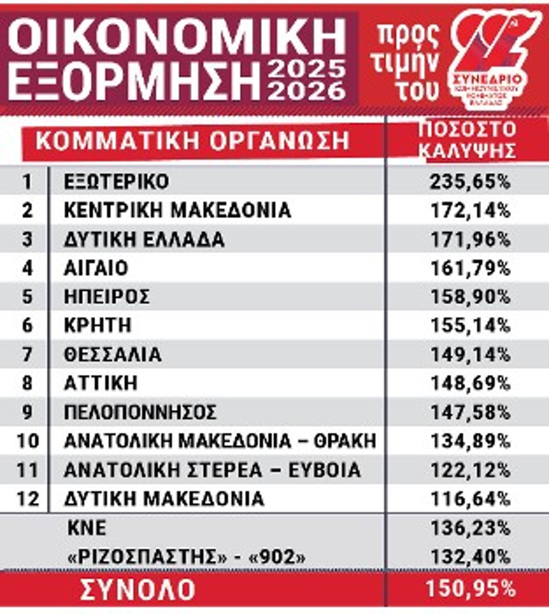 Συνολικά όλες οι ΤΟ έπιασαν και υπερκάλυψαν το οικονομικό πλάνο τους, με την επιτυχία της Οικονομικής Εξόρμησης για ακόμα μια χρονιά να αποδεικνύει τους ολοένα και πιο διευρυμένους δεσμούς της ΚΟ Κρήτης με τον λαό και την εργατική τάξη του νησιού.