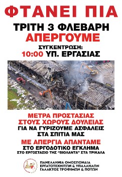 Και προσθέτει: «Απέναντι στο κυνήγι του κέρδους προβάλλουμε τις πραγματικές ανάγκες των εργαζομένων, που μπορούν να κατακτηθούν μόνο μέσα από τον οργανωμένο αγώνα στους χώρους δουλειάς, στα σωματεία, για να καρπώνονται οι εργαζόμενοι αυτά που παράγουν. Που τώρα όχι μόνο δεν τα καρπώνονται, αλλά χάνουν ακόμα και τη ζωή τους στο μεροκάματο. Καλούμε τους εργαζόμενους και των υπόλοιπων κλάδων, καθώς και τον λαό των Τρικάλων να στηρίξει την απεργία, για να καταδικαστεί πλατιά το εργοδοτικό έγκλημα».
