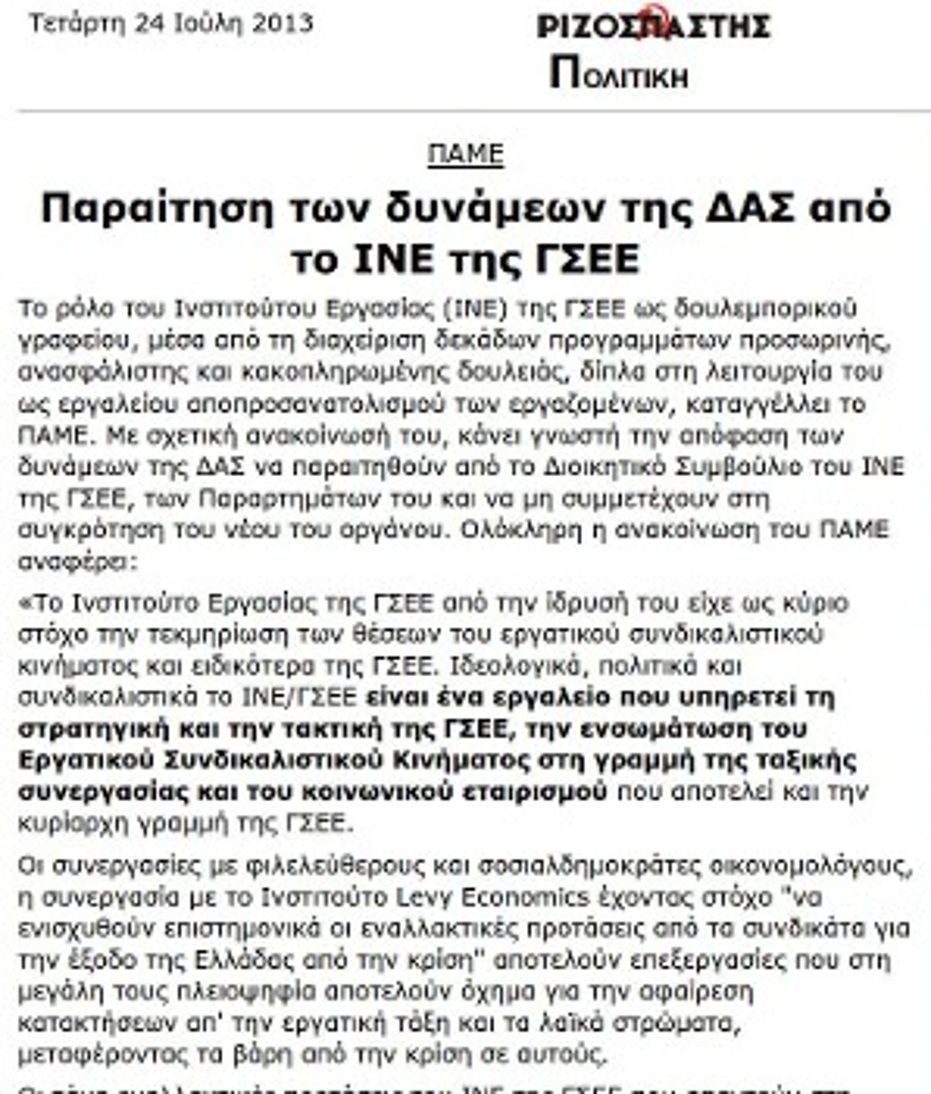 Σε αυτή σημειωνόταν αναλυτικά: «Διαβρωτική είναι η παρέμβαση του ΙΝΕ της ΓΣΕΕ και των παραρτημάτων του, η οποία θα συνεχιστεί. Πρόκειται για ινστιτούτο διασυνδεδεμένο με τα αντίστοιχα ερευνητικά μελετητικά ιδρύματα των ενώσεων εργοδοτών (ΣΕΒ), των Επιμελητηρίων και των κρατικών υπηρεσιών του υπουργείου Εργασίας και Κοινωνικής Ασφάλισης. Διαθέτει προϋπολογισμό εκατομμυρίων ευρώ, διαχειρίζεται μεγάλο όγκο ευρωπαϊκών προγραμμάτων, ιδιαίτερα τα προγράμματα επιμόρφωσης, κατάρτισης, μελετών, ακόμα και προγράμματα από το ΕΣΠΑ. Επίσης συνεργάζεται με τα αντίστοιχα ινστιτούτα συνδικάτων σε επίπεδο Ευρωπαϊκής Ενωσης, με τα ιδρύματα της ευρωπαϊκής και διεθνούς σοσιαλδημοκρατίας. Διακηρυγμένος στόχος του είναι η εμπέδωση του "κοινωνικού εταιρισμού", δηλαδή της "συνεργασίας των τάξεων", γι' αυτόν τον λόγο λειτουργεί και Ακαδημία Στελεχών (ΙΕΚ εργατοπατέρων). Συμμετέχει και σχεδιάζει από κοινού με τις εργοδοτικές οργανώσεις και τις κυβερνήσεις την αντεργατική πολιτική και την προώθηση των αναδιαρθρώσεων, καθιστώντας τη Συνομοσπονδία συνδιαμορφωτή της. Επίσης αξιοποιείται για τη διαμόρφωση συνδικαλιστικών συσχετισμών, καθώς σε πολλές περιπτώσεις οι συμμετέχοντες στα προγράμματα μετατρέπονται σε εκλογικό σώμα».