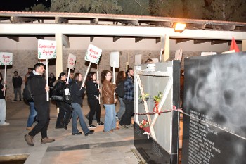 «Εδώ, στους δρόμους της Καισαριανής που έσταζε το ηρωικό αίμα των συντρόφων. Εδώ, μπροστά στο Σκοπευτήριο που στέκει και θυμίζει. Εδώ, τα κόκκινα σημάδια στους τοίχους, τα χνάρια των 200, γίνονται πυξίδα για κάθε νέο κομμουνιστή και κομμουνίστρια, μέλος της ΚΝΕ.