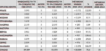Η εντυπωσιακή άνοδος συμμετοχής των εργαζομένων που εμφανίζουν τέτοια Εργατικά Κέντρα σε συγκεκριμένους νομούς, που είναι πρωταθλητές στην υλοποίηση προγραμμάτων ή που παρεμβαίνει με άμεσο τρόπο η εργοδοσία, είναι αποκαλυπτική. Η σύγκριση γίνεται με τα στοιχεία του Συνεδρίου της ΓΣΕΕ το 2013, δηλαδή πριν εκφραστούν στη δύναμη των συνδικάτων οι συνέπειες της καπιταλιστικής κρίσης όπως εμφανίστηκαν την επόμενη τριετία, 2013 - 2016.