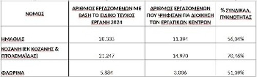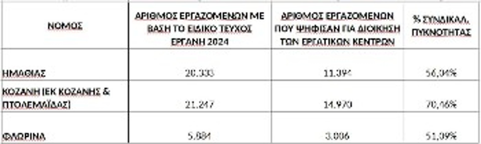 Σε ορισμένους νομούς όπου η ανεργία είναι μεγάλη, όπως στη Δυτική Μακεδονία και στην Ημαθία, όπου η παραγωγή (π.χ. της Ενέργειας, η αγροτική παραγωγή κ.λπ.) έχει χτυπηθεί από την αντεργατική πολιτική και όπου τα σεμινάρια από τα ευρωπαϊκά προγράμματα διαδέχονται το ένα το άλλο, κατά έναν περίεργο τρόπο εμφανίζεται μια συνδικαλιστική πυκνότητα που διεκδικεί παγκόσμιες πρωτιές. Η σύγκριση γίνεται με τα στοιχεία του συστήματος «Εργάνη» του 2024 και τους ψηφίσαντες για αντιπροσώπους για τη διοίκηση των συγκεκριμένων Εργατικών Κέντρων στις τελευταίες τους αρχαιρεσίες.