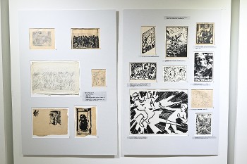 Ξεχωριστό κομμάτι είναι τα σκίτσα, τα χαρακτικά, οι γελοιογραφίες που φιλοτέχνησε ως Φάνης, ΕΠΟΝίτης σπουδαστής της Καλών Τεχνών, που όπως και τόσοι άλλοι έθεσαν την Τέχνη τους στον αγώνα του λαού μας.