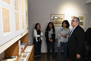 Στη συνέχεια ο Δ. Κουτσούμπας καθώς και οι επισκέπτες του χώρου ξεναγήθηκαν στην Εκθεση. Ανάμεσά τους ήταν και η λογοτέχνης Ζωή Βαλάση και ο πρόεδρος του Επιμελητηρίου Εικαστικών Τεχνών Ελλάδας Νάσος Χαλκίδης.