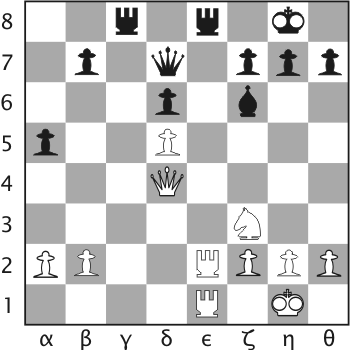 1. δ4 δ5 2. γ4 γ6 3. Ιγ3 Ιζ6 4. ε3 α6 5. Ιζ3 β5 6. β3 Αη4 7. θ3 Α:ζ3 8. η:ζ3 Ιβδ7 9. ζ4 ε6 10. γ5 Ιε4 11. Ι:ε4 δ:ε4 12. Αη2 ζ5 13. ζ3 ε:ζ3 14. Α:ζ3 Πγ8 15. Βε2 Ιζ6 16. Αδ2 Ιδ5 17. ε4 Βθ4+ 18. Ρδ1 Ι:ζ4 19. Βε1 Ιη6 20. ε:ζ5 Β:δ4 21. Β:ε6+ Ιε7 22. Ρε2 Βδ7 23. Βε3 θ5 24. Παζ1 Ρζ7 25. Ρδ1 Ιδ5 26. Βη5 Αε7 27. Βη6+ Ρη8 28. Πθη1 Α:γ5 29. Α:δ5+ γ:δ5 30. ζ6 Α:η1 31. ζ7+ Ρζ8 32. Π:η1 Β:ζ7 33. Β:α6 Βζ3+ 0-1.