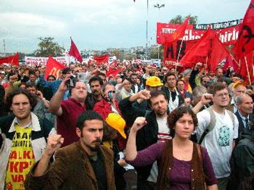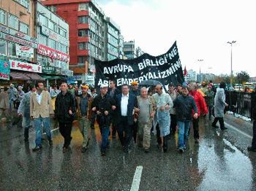 «Οι ξένες δυνάμεις έρχονται στη χώρα μας για φτηνούς εργάτες, για να επιβάλλουν το δικό τους πολιτισμό, να αυξήσουν τα κέρδη τους. Λίγοι είναι αυτοί που χαίρονται από τον ερχομό της ΕΕ, είναι αυτοί που θα κερδίσουν»... Το μικρό αυτό απόσπασμα είναι από την ομιλία του ΓΓ του ΚΚ Τουρκίας, Κεμάλ Οκουγιάν, στη δυναμική συγκέντρωση (φωτογρ.), που οργάνωσε προχτές στην Ιστανμπούλ το Πατριωτικό Μέτωπο (συσπείρωση την οποία στηρίζει το ΚΚ Τουρκίας), ολοκληρώνοντας με τον καλύτερο τρόπο τη Διεθνή Συνάντηση των κομμουνιστικών κομμάτων και αντιιμπεριαλιστικών οργανώσεων.