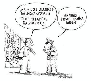 Πονηρά, αυτοί που δημιουργούν με την πολιτική τους την ανεργία, την υποβάθμιση του περιβάλλοντος, την καταπάτηση των εργασιακών δικαιωμάτων, εκδηλώνουν ενδιαφέρον για τα κυκλοφοριακά προβλήματα που, κατά την άποψή τους, δημιουργούνται από τα συλλαλητήρια. «Εχουν και οι πολίτες που δε διαδηλώνουν δικαιώματα», κραυγάζουν υποκριτικά. Λες, και αυτοί που διαδηλώνουν είναι οι κακομαθημένοι, οι οποίοι τις υπόλοιπες μέρες μετακινούνται με τα ελικόπτερα και τις λιμουζίνες τους, ενώ τροχονόμοι τούς ανοίγουν το δρόμο για να πάνε πιο γρήγορα στις δουλιές τους. Ο εργαζόμενος που διαδηλώνει κινείται και αυτός είτε ως πεζός, είτε ως εποχούμενος στους ίδιους δρόμους. Πάσχει και αυτός από το κακό κυκλοφοριακό της πρωτεύουσας. Ξέρει πως δεκαετίες χαοτικής οικιστικής «ανάπτυξης» της Αθήνας δημιούργησαν το κυκλοφοριακό χάος. Και αγωνίζεται να βελτιωθεί η κατάσταση. Αλλά ο αγώνας θέλει δράση. Θέλει συνέλευση, συγκέντρωση, διαδήλωση. Αλλιώς είναι κάτι άλλο.