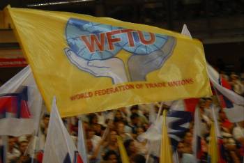 Κι αν ακόμα οι συνδικαλιστικές αντιπροσωπείες που φτάνουν λίγο πριν τις οκτώ δεν μπορούν να μεταφράσουν τα λόγια των διαδηλωτών, η υποδοχή είναι τέτοια που δίνει κρυστάλλινο το μήνυμα. Περνώντας ανάμεσα σε συνθήματα από μια αψίδα φτιαγμένη με σημαίες του Λιβάνου, της Παλαιστίνης, της ΠΣΟ και του ΠΑΜΕ, οι συνδικαλιστές καταλήγουν στην αίθουσα της εκδήλωσης. Εκεί όπου χιλιάδες εργάτες, εργάτριες και νεολαίοι, που όλες τις προηγούμενες μέρες διαδήλωναν στους δρόμους της Αθήνας, σηκώθηκαν όρθιοι για να χειροκροτήσουν τα ταξικά τους αδέρφια, μέσα σε διεθνιστικά τραγούδια και συνθήματα: «Αλληλεγγύη στην πάλη των λαών κάτω η νέα τάξη των ιμπεριαλιστών». Νέοι και νέες ανεμίζουν ζωηρά, σηκώνουν ψηλά τις σημαίες του ΠΑΜΕ και της ΠΣΟ, καλωσορίζουν εγκάρδια έναν προς έναν τους συνδικαλιστές που φέρνουν απ' τις πατρίδες τους ένα ακόμα «venceremos».
