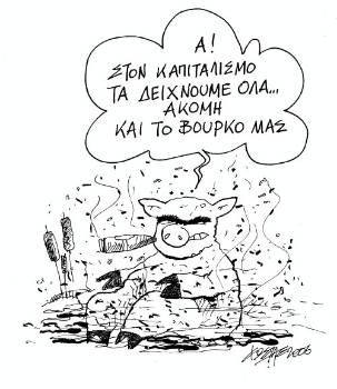 Ετσι και με τα τραπεζικά κέρδη: Οσο πιο μεγάλο, λέει ο κυβερνητικός Τύπος, γίνεται ένα τραπεζικό τραστ, τόσο πιο πολύ συμφέρει το λαό. Εγγυητής, λέει, η Τράπεζα Ελλάδας! Η οποία, όμως, χρόνια πριν, υπάρχει μόνο ως παράρτημα της Ευρωπαϊκής Κεντρικής Τράπεζας, αυτής που λέει, όπως και η της Ελλάδας, πως πρέπει να συμπιεστούν κι άλλο οι μισθοί, να πάνε οι συντάξεις στο ογδόντα φεύγα...