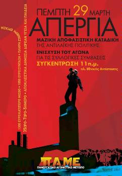 Την πεπατημένη της απεργοσπασίας επέλεξε για μια ακόμη φορά η πλειοψηφία (ΣΥΝ - ΠΑΣΚΕ) του Σωματείου Ιματισμού Θεσσαλονίκης, επιβεβαιώνοντας ότι ρόλος της είναι να κουβαλά νερό στο μύλο της εργοδοσίας. Στην πρόσφατη συνεδρίαση του ΔΣ του Σωματείου, η πλειοψηφία ΣΥΝ - ΠΑΣΚΕ, αρνήθηκε να πάρει απόφαση συμμετοχής στην απεργία που κήρυξε η Ομοσπονδία του κλάδου (ΟΕΚΙΔΕ) για τις 29 Μάρτη, κλιμακώνοντας τον αγώνα για την υπεράσπιση των Συλλογικών Συμβάσεων. Τη νέα κατρακύλα των ΠΑΣΟΚοΣΥΝεταίρων καταγγέλλει η παράταξη «Ταξική Ενότητα - Συνεργασία» που ανέλαβε να σηκώσει το βάρος της απεργίας στις πλάτες της, με καθημερινές εξορμήσεις σε χώρους δουλιάς.