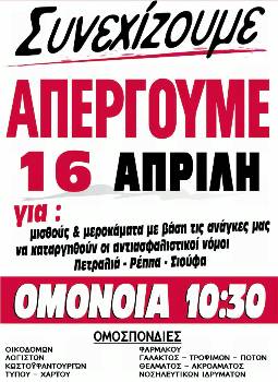 Το ΚΚΕ καλεί όλους τους εργαζόμενους να πάρουν την υπόθεση του αγώνα στα χέρια τους. Με τη συμμετοχή τους να μαζικοποιήσουν τα σωματεία, να τα κάνουν δραστήρια, εργαλεία της πάλης για τα σύγχρονα δικαιώματά τους. Να παραμερίσουν τις συνδικαλιστικές ηγεσίες που δεν αντιπαλεύουν την καπιταλιστική εργοδοσία και υπογράφουν απαράδεκτες συμφωνίες με αυτή. Σε κάθε χώρο εργασίας πρέπει να οργανωθεί η συμμετοχή στην απεργία στις 16 Απρίλη, που διοργανώνουν οι συνδικαλιστικές οργανώσεις που συσπειρώνονται στο ΠΑΜΕ για τα σύγχρονα ασφαλιστικά δικαιώματα, για πραγματικές αυξήσεις. Αυτό το κίνημα υπολογίζει το κεφάλαιο και οι πολιτικοί του υπηρέτες».