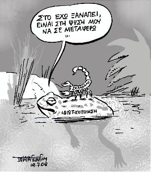 - Συνεδρίαση της Βουλής σε επίπεδο πολιτικών αρχηγών, 22 Μάρτη 2007, με θέμα την οικονομία. Διαβάζουμε (από τα Πρακτικά και από το «Ριζοσπάστη», 23 Μάρτη, σελίδα 7 - ομιλία Αλέκας Παπαρήγα): «Αλέκα Παπαρήγα: Στην πορεία των ιδιωτικοποιήσεων και στην πραγματοποίησή τους υπάρχουν τρωκτικά, δεν υπάρχει αμφιβολία (...). Δηλαδή υπάρχουν πρόσωπα πολιτικά, διοικητικά, τα οποία επωφελούνται (...). Ιδιωτικοποιούνται εταιρείες και τα μεγαλύτερα σκάνδαλα είναι σε αυτές (...). Με πολλή φούρια η ΝΔ μετά τις εκλογές ρίχτηκε να πουλήσει ό,τι δεν είχε προλάβει το ΠΑΣΟΚ. Και όχι μόνο αυτό αλλά κάνει εμβάθυνση στις ιδιωτικοποιήσεις που είχε ξεκινήσει το ΠΑΣΟΚ (...). Προχώρησε λοιπόν με τη σειρά της και το 35% του Ταχυδρομικού Ταμιευτηρίου μπήκε στο Χρηματιστήριο, πουλήθηκε και το 11% της Εμπορικής, μεταβίβασε πακέτα μετοχών σε ιδιώτες του ΟΤΕ, των ΕΛΠΕ, του ΟΠΑΠ, της Αγροτικής, της ΔΕΠΑ, της ΓΕΡΜΑΝΟΣ. Ολα αυτά είναι μέσα σ' αυτή τη διαδικασία. Ιδιωτικοποίηση, εξαγορά και συγκέντρωση. Λεηλάτησε τα Ολυμπιακά ακίνητα. Αυτό είναι το έργο της ΝΔ. Με αποικιακού τύπου συμβάσεις με διάφορες επιχειρηματικές κοινοπραξίες».