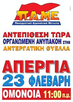 «Στις 23 του Φλεβάρη φοιτητές και μαθητές δεν κάνουμε μάθημα». Με αυτά τα λόγια το Μέτωπο Αγώνα Σπουδαστών απευθύνεται στους μαθητές και τις μαθήτριες μπροστά στην απεργία, σημειώνοντας ότι μαθητές, σπουδαστές και φοιτητές έχουν κοινό αντίπαλο: Την πολιτική ΠΑΣΟΚ - ΝΔ - ΕΕ - ΔΝΤ που τσακίζει τις κατακτήσεις του εργατικού κινήματος, που απολύει τους γονείς τους και θέλει τους ίδιους εργαζόμενους με χαμηλές απαιτήσεις και με μισθό χαρτζιλίκι. «Αυτή η πολιτική φέρνει ένα νέο νόμο στην Παιδεία. Αυτός ο νόμος λέει ότι εσύ θα μπαίνεις σε ένα πλήρως ιδιωτικοποιημένο Πανεπιστήμιο. Αν καταφέρεις να περάσεις στη σχολή θα πληρώνεις δίδακτρα και τελικά θα σου δίνει ένα πτυχίο κουρελόχαρτο που δε θα σου εξασφαλίζει τίποτα. Δε θα μπαίνεις σε τμήμα, αλλά σε σχολή και θα χρειάζεσαι ακόμα ένα χρόνο με φροντιστήρια και έξοδα για να ξαναδώσεις εξετάσεις να περάσεις στο τμήμα που θέλεις», αναφέρει το ΜΑΣ, καλώντας σε συμμαχία για την ανατροπή.