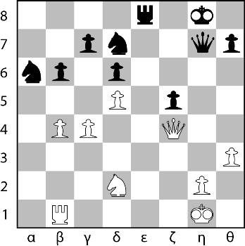 1. ε4 γ6 2. δ4 δ5 3. ε5 Αζ5 4. θ4 θ6 5. η4 Αδ7 6. θ5 ε6 7. ζ4 γ5 8. γ3 Ββ6 9. Ιζ3 Αβ5 10. Αχβ5 + Βχβ5 11. Ια3 Ββ6 12. Βα4 + Ιγ6 13. Ιγ2 γχδ4 14. γχδ4 Βα5+ 15. Βχα5 Ιχα5 16. Ρε2 Ιε7 17. β3 Πγ8 18. Ρδ3 Ιαγ6 19. Αδ2 Πγ7 20. Ιθ4 Ιγ8 21. ζ5 α5 22. Παζ1 Πη8 23. Πθ2 ζ6 24. εχζ6 ηχζ6 25. Ιε3 ε5 26. Ιχδ5 Πζ7 27. Ιη6 Ιχδ4 28. Αε3 Ιγ6 29. Ρε2 Αη7 30. Ρζ3 Πδ7 31. Πδ2 Ρζ7 32. Πζδ1 Πηδ8 33. Ρζ2 Ρε8 34. Ρε1 Ιδ4 35. Αχδ4 Πχδ5 36. Αγ3 Πχδ2 37. Αχδ2 β6 38. Πγ1 Ρδ7 39. Αε3 Πε8 40. Ρε2 Ρδ6 41. Ρδ3 Ρδ7 42. Πγ3 Αζ8 43. Ρε4 Αβ4 44. Πγ2 Ιδ6+ 45. Ρδ5 Ιβ5 46. Αχθ6 Ιγ3+ 47. Πχγ3 Αχγ3 48. Αε3 Αδ4 49. Αχδ4 εχδ4 50. Ρχδ4 Ργ6 51. θ6 Πδ8+ 52. Ρε4 Πδ7 53. η5 και 1-0.