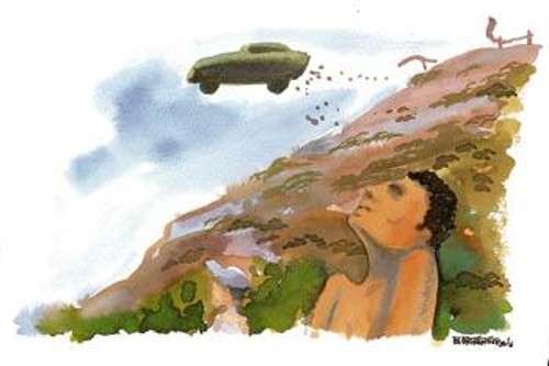 Ο ασυρματιστής έσφιξε γερά το τιμόνι με τα δυο του χέρια κι έδωσε εντολή στο δεξί του πόδι να πατήσει φρένο, μα το πόδι πάτησε γκάζι και το αμάξι όρμησε μπροστά. Αυτό τον αιφνιδίασε. Προσπαθώντας να ελέγξει το τιμόνι που του ξέφευγε, το 'φερε λίγο προς δεξιά, τότε όμως βρέθηκε μπροστά του το μεταλλικό κολωνάκι, το οποίο υποχώρησε και το αμάξι βρέθηκε στο κενό, απογειώθηκε, ανέπτυξε ταχύτητα, πέταξε σαν αεροπλάνο, σαν αεριωθούμενο, σαν ρουκέτα, έσκισε τους αιθέρες και χάθηκε στον ορίζοντα. Η εμφάνιση του ιπτάμενου αντικειμένου, και στη συνέχεια η εξαφάνισή του, κατατρόμαξε τους λουόμενους που κολυμπούσαν ή έκαναν ηλιοθεραπεία - άντρες, γυναίκες και παιδιά.