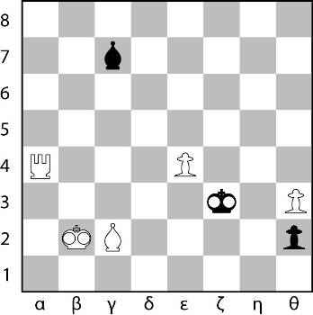 Πολύ διδακτική άσκηση, όπου κυριαρχεί η δομή των πιονιών του μαύρου, ενώ ο βασιλιάς του θα προλάβει το ελεύθερο «θ» πιόνι. 1... η4+! 2. Βη4 (αν 2. Ρη4; Βζ5+ ματ) 2... Βζ5! 3. θ5 γ4 4. θ6 Βη4+ 5. Ρη4 Ρζ6 και 0-1.