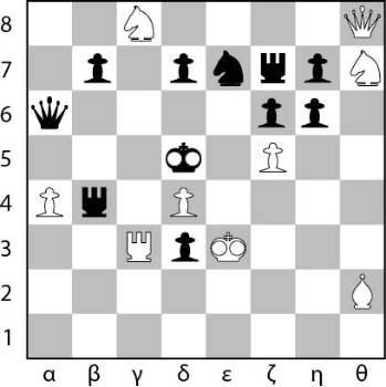 Παίζουν τα λευκά και κάνουν ματ σε δύο (2) κινήσεις. 1. Βη4 Α~ 2. Αγ2+Χ. Αν 1... Ι~ 2. Αγ6Χ. Αν 1... α5 2. Ιγ5+ ματ!