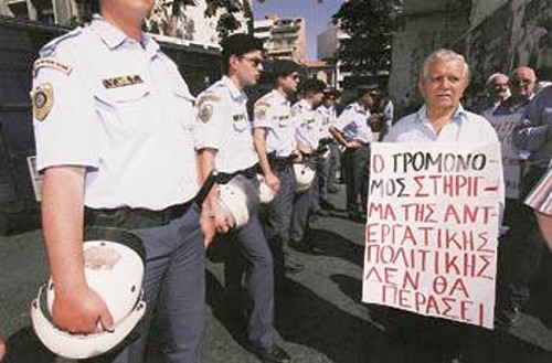 Οι συνταξιούχοι που ανταποκρίθηκαν χτες στο κοινό κάλεσμα των συνεργαζομένων Ομοσπονδιών ΙΚΑ - ΤΕΒΕ - ΤΣΑ - ΝΑΤ - ΔΗΜΟΣΙΟΥ - ΤΑΕ, και βγήκαν πάλι στους δρόμους, είδαν για πρώτη φορά την οδό Πειραιώς - κοντά στο ύψος της Μενάνδρου - κλειστή από δύο κλούβες των ΜΑΤ και μπροστά παραταγμένες διμοιρίες αστυνομικών. Η αντίδραση των «ασπρομάλληδων» απόμαχων ήταν άμεση, φωνάζοντας: «Ο νόμος του ΠΑΣΟΚ για την τρομοκρατία, είναι αντιγραφή των εντολών της ΣΙΑ» και «ο διάλογός τους είναι μια απάτη, νόμος είναι το δίκιο του εργάτη».