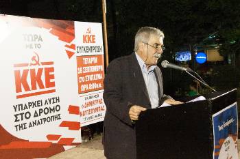 -- Γιατί, μήπως, τώρα τα προγράμματα του μνημονίου, τι είναι; Τα δισέγγονά μας θα πληρώνουν γι' αυτά που ψηφίσανε οι κύριοι, πριν ένα μήνα, τον Αύγουστο και οι προηγούμενοι με τα άλλα δυο μνημόνια που έχουμε στην πλάτη μας. Και ακόμα δεν ξέρουμε πού θα μας οδηγήσει αυτή η κατάσταση, δηλαδή οι δυσκολίες, αυτός ο Γολγοθάς που βιώνει ο λαός μας καθημερινά. Και δεν ξέρουμε ακόμα αν θα ανοίξει έστω και μια πόρτα, μια μικρή ανάκαμψη στοιχειωδώς, που δεν υπάρχει περίπτωση κατά την εκτίμησή μας στο άμεσο μέλλον, τι είναι; Μιλάνε, όχι για πέντε χρόνια δυσκολιών ή και για δέκα, αν θέλετε. Μιλάνε για δεκαετίες που θα βιώνουμε αυτό το πράγμα και θα είναι μόνιμα τα υποζύγια. Ενας λαός που θα είναι στην εξουσία με όλες τις δυσκολίες, θα είναι διατεθειμένος να κάνει πολλές θυσίες. Μπορεί να κάνει θυσίες αλλά να ανοίγει το μέλλον για μια κυβέρνηση, για μια εξουσία, για ένα πρόγραμμα στην οικονομία, στην κοινωνία που θα είναι υπέρ των λαϊκών συμφερόντων, υπέρ των λαϊκών αναγκών. Και να έχει δυσκολίες τώρα, τουλάχιστον, να υπάρχει ξέφωτο. Εδώ δεν υπάρχει ξέφωτο. Εδώ συνεχώς θα πηγαίνουμε από το κακό στο χειρότερο. Ιδιαίτερα αν επιβεβαιωθούν οι εκτιμήσεις που υπάρχουν όχι μόνο στο ΚΚΕ, ευρύτερα και σε άλλα κόμματα, σε οικονομολόγους, σε διεθνείς οργανισμούς, ότι η κρίση που έρχεται θα είναι πιο βαθιά από αυτή που γνωρίσαμε, όταν ξεκίνησε το 2008 - 2009, διότι πλέον θα συμπεριλάβει ισχυρές καπιταλιστικές οικονομίες. Δεν μιλάμε δηλαδή για την Ελλάδα. Και δεν θα εξαρτάται, αν θέλετε, μόνο από την Ελλάδα, γιατί τα μεγέθη της είναι πάρα πολύ μικρά.