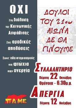 Παράσταση διαμαρτυρίας στο υπουργείο Εργασίας (Σταδίου 29) διοργανώνει η ΟΓΕ στις 15 Οκτώβρη, στις 9 π.μ., με αφορμή τις δηλώσεις του υπουργού, Γ. Κατρούγκαλου, για το Ασφαλιστικό. Η ΟΓΕ διεκδικεί την επαναφορά της παροχής επιδόματος τοκετού σε όλες τις γυναίκες που γεννάνε σε ιδιωτικά ή δημόσια νοσοκομεία.