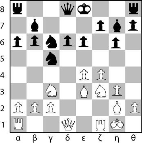Το 9... Αη7 δεν είναι καλό γιατί θα ακολουθούσε 10. ε5 δε5 11. δε5 Ιδ7 12. Ιε4 Ιδε5 13. Αη5 Βδ4+ 14. Ρθ1 0-0 15. γ3 Βδ7 16. Ιζ6+ με αρκετές επιθετικές δυνατότητες για το πιόνι. 10. Ιζ3 α6 11. δ4 Αη7 12. δγ5. Στο 12. δ5 Ιδ4 13. Ιδ4 γδ4 14. Ιε2 εδ5 15. εδ5 Βζ6 με ικανοποιητικό παιχνίδι. 12... Ιγ5 13. Αε3 (βλέπε διάγραμμα) Ισχυρότερο ήταν το 13. ζ5 (Συνεχίζεται)