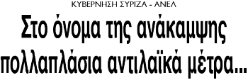 Κατά τ' άλλα η κυβέρνηση πανηγύρισε τόσο για την «υπέρβαση» των κρατικών εσόδων από τα χαράτσια που φόρτωσαν στο λαό η ίδια και οι προκάτοχοί της όσο και για τις προβλέψεις του ΔΝΤ για τους ρυθμούς ανάκαμψης της ελληνικής καπιταλιστικής οικονομίας. Ολες, μα όλες οι προβλέψεις και παρεμβάσεις των ιμπεριαλιστικών επιτελείων και των εκπροσώπων του κεφαλαίου της περασμένης βδομάδας «υπενθύμισαν» ότι προϋπόθεση για την όποια ανάκαμψη είναι η πλήρης εφαρμογή του μνημονίου και των αντιλαϊκών αναδιαρθρώσεων που αυτό περιλαμβάνει. Επιβεβαιώνεται, δηλαδή, ότι η ανάκαμψη των κερδών του κεφαλαίου όχι μόνο δε θα φέρει ανακούφιση στο λαό, αλλά προϋποθέτει νέα κλιμάκωση με μόνιμα αντιλαϊκά μέτρα.