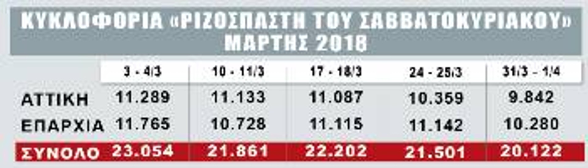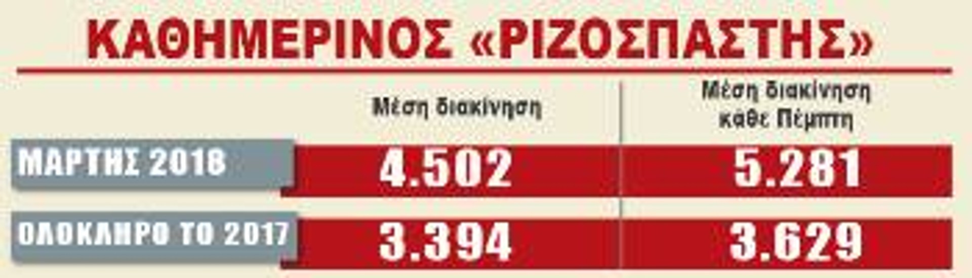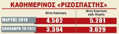 Αντίστοιχη αύξηση της κυκλοφορίας δείχνουν τα στοιχεία και για το καθημερινό φύλλο. Κατά μέσο όρο, το φετινό Μάρτη διακινήθηκαν 4.502 φύλλα κάθε μέρα, αύξηση 32,6% σε σχέση με ολόκληρο το 2017.