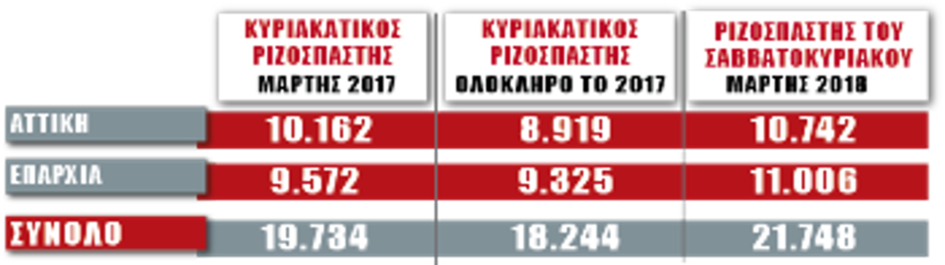 Πιο συγκεκριμένα, η μέση κυκλοφορία του «Ριζοσπάστη του Σαββατοκύριακου» για το μήνα Μάρτη είναι 21.748 φύλλα, αυξημένη κατά 19,2% σε σχέση με ολόκληρο το 2017 και κατά 10,2% σε σχέση με το Μάρτη του 2017.